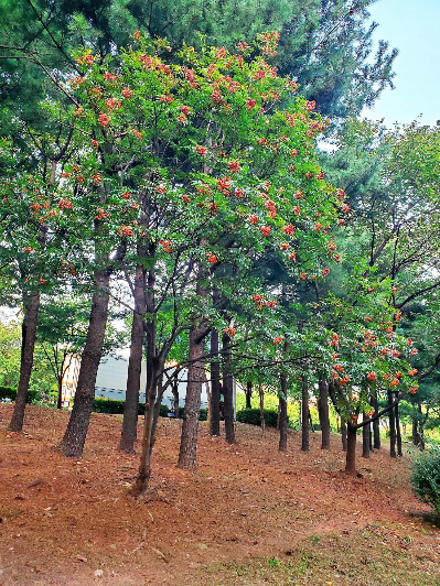 동네 한바퀴, 두바퀴 걷는 것이 오로지 생활의 기쁨이며 목적인 양 매일 걸었는데, 발바닥에 염증이 생겨 한 달 동안 산책을 못하고 있다. 꾸준한 물리치료 덕분에 오랜만에 걸었다. 그동안 마가목의 푸른 열매가 붉게 물들어 화려한 황금기를 보내고 있는 것이 눈에 띄었다. 곁에 있는 키가 작은 산수유는 붉은 색이 되기 위해 온 힘을 쏟고 있다. 숲 속에서 꽃을 피우는 꽃나무 중, 산수유는 초봄에 피는 꽃나무로 제일 먼저인 듯 노란꽃을 피우지만 열매는 마가목이 더 빠르게 물들이고 있었다